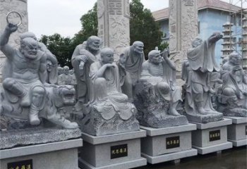 在佛教中,彩繪大型景觀笑容十八羅漢雕塑次于佛和菩薩,因此地位也比他們低,他們住的地方只能叫堂,而不能叫做殿的。