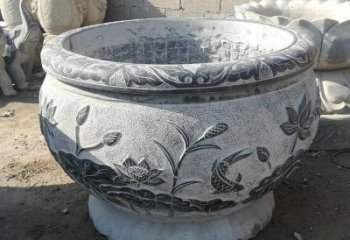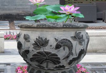 仿古青石水缸魚缸安放荷花刻飾鯉魚