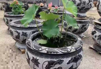 古老石槽,精致圓形養魚水缸,由青石雕刻而成,是一款充滿古樸氣息的水缸。水缸的外觀由精致的青石雕刻而成,形狀是圓形,墻壁高而厚,中央有一個古老的石槽,邊緣處是一道微微波動的水流,整體外觀高雅典雅,充滿古樸氣息。